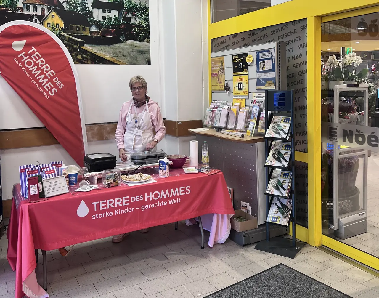 Dem Duft frisch gebackener Waffeln kann sich kaum jemand entziehen… Dies nutzte unsere Terre des Hommes-Gruppe Marburg erfolgreich. An einem Vormittag im Advent wurden im nahegelegenen Supermarkt fleißig Waffeln gebacken und gegen Spende abgegeben. Die Aktiven freuten sich beim Kassensturz über das schöne Ergebnis von 274 Euro. Dieses Geld kommt Kindern in unseren weltweiten Projekten zugute.