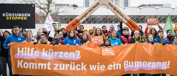 Um ihrer Forderung öffentlich Nachdruck zu verleihen, protestierten die im Bündnis #LuftNachOben zusammenarbeitenden Organisationen am Montag, 10. November, mit einem riesigen Bumerang vor dem Bundestag. Die Botschaft der Protestaktion lautet: Die Haushaltskürzungen von heute kommen morgen als Krisen zurück – wie ein Bumerang. Hinter #LuftNachOben steht eine Gruppe entwicklungspolitischer und humanitärer Nichtregierungsorganisationen, die sich gemeinsam für Investitionen zur Bekämpfung von Armut, Hunger und Ungleichheit wie auch zur Stärkung des humanitären Systems einsetzen.