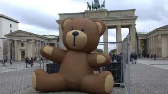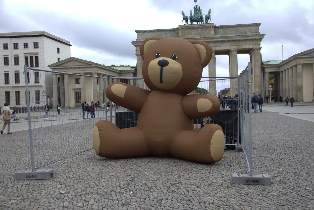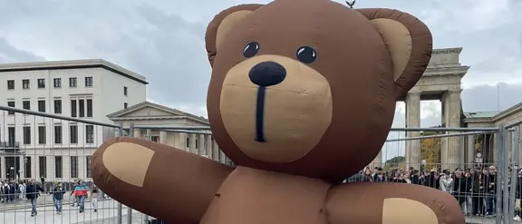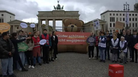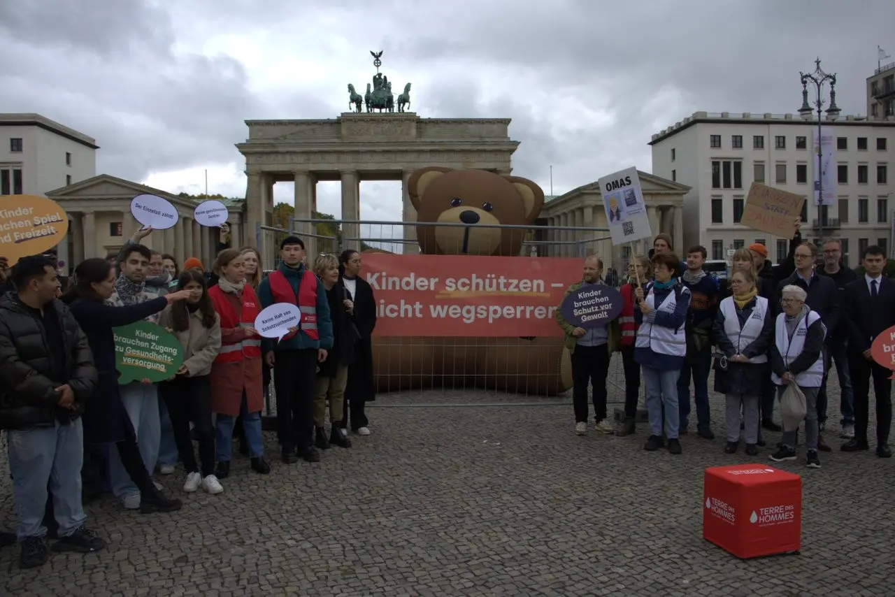 Terre des Hommes, PRO ASYL und weitere Organisationen protestierten vor dem Brandenburger Tor. Mit einem überlebensgroßen Teddybären, der hinter einem Zaun stand, forderten die Organisationen die Abgeordneten des Deutschen Bundestags auf, bei der Umsetzung der GEAS-Reform Kinder- und Menschenrechte einzuhalten.